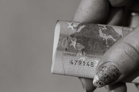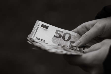 Giving money like a bribe or tips. Holding EURO banknotes in black and white