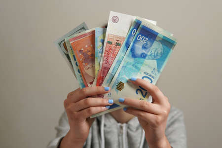 An unrecognizable person holding banknotes of different counties including Israeli Shekel -, finance