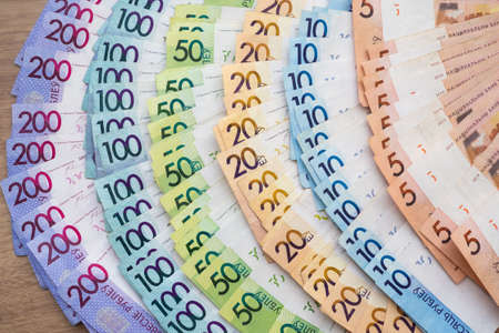 Belarusian paper money on wooden background. many colored currency of different denominations. Banknotes of the Republic of Belarus. close up
