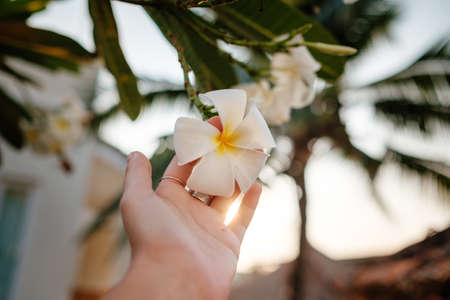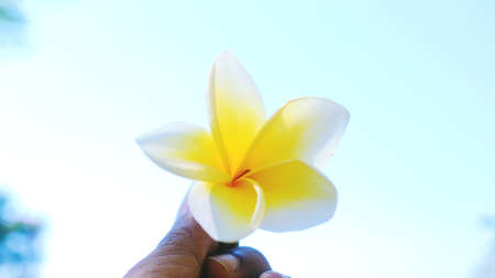 woman hand holding plumeria flower