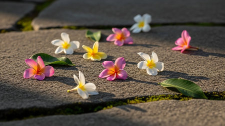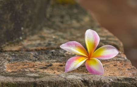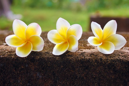 Frangipani flowers on the cement floor in the garden.