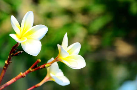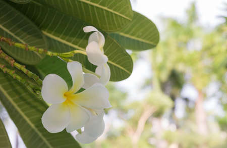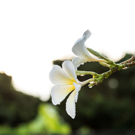 White Plumerial flower over blurred nature background, outdoor day light, spring and summer season concept