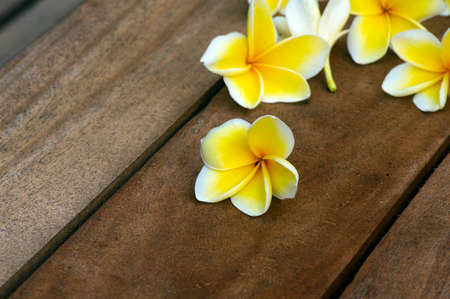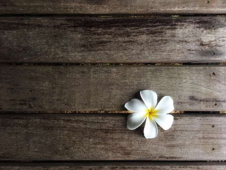 White frangipani on wooden boardwalk background