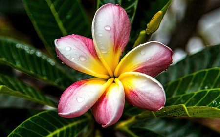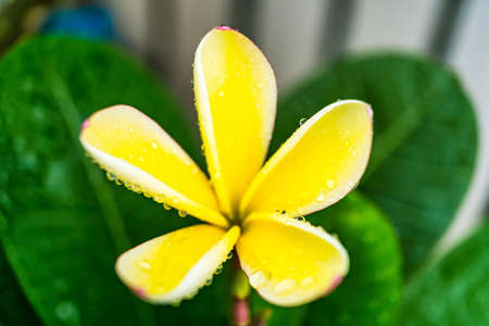 Frangipani or Plumeria flower with water drop on leaf