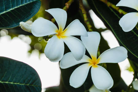 purity of white Plumeria or Frangipani flowers. spa flower blossom of tropical tree Spring landscape of Plumeria flower Bright colorful flowers with Beautiful sunlight in the morning. Selected focus