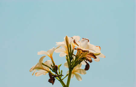 Blossoming tropical flowers frangipani in pastel colors with sunlight as tropical wedding background in vintage style