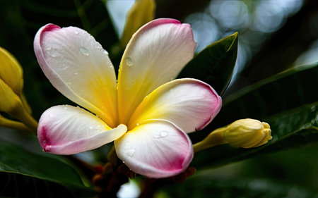 Plumeria flower with water droplets on the petals.