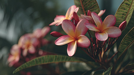 Plumeria swaying gently in the wind, realistic photography style, bright and vivid colors, natural lighting, detailed textures on the leaves, soft motion blur to suggest wind movement, ultra realistic, high resolution, cinematic atmosphere.