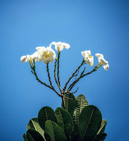 Beautiful white frangipani flowers on the tree