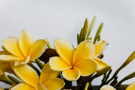 Close up of yellow frangipani flowers isolated on white background