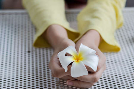 Woman hands holding white plumeria flower on the with table. Welcome to Thailand. Thai hospitality concept. Top view. yellow color background. copy space.