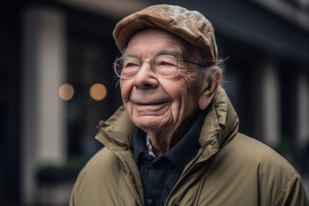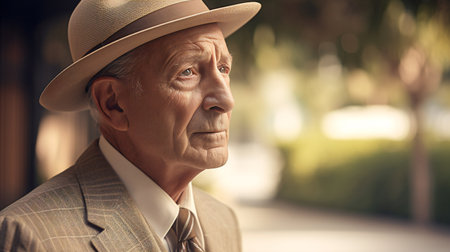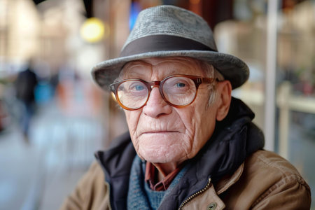 Closeup of a contemplative senior man wearing a hat and glasses, captured on a city street