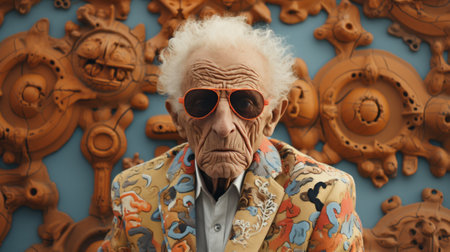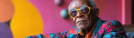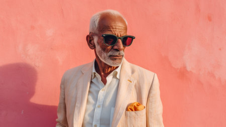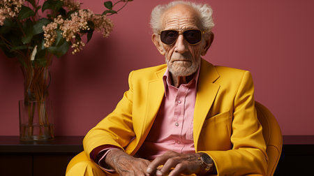an older man exuding cool confidence in his sunglasses against a vibrant pastel background. This compelling image captures the essence of timeless style and the joy of warm-weather moments
