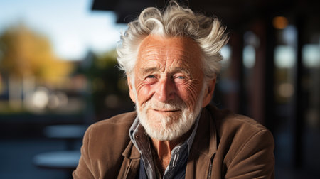 Portrait of a senior man with grey hair in the street. Generative AI.