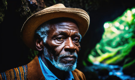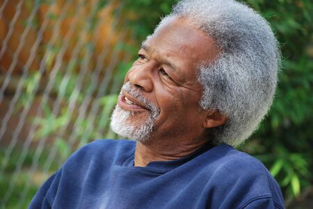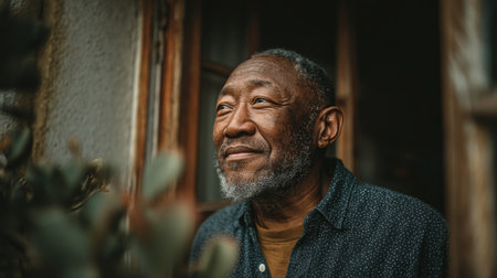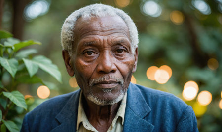 A seniorblack man gazing peacefully outdoors, conveying wisdom, calmness, and thoughtfulness