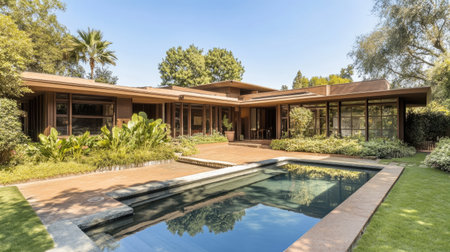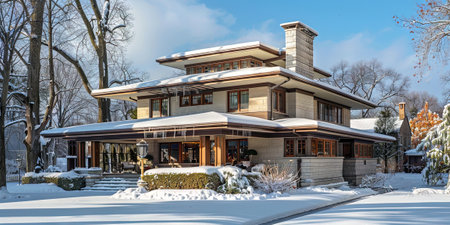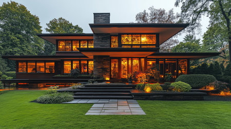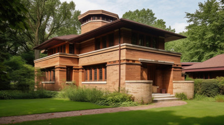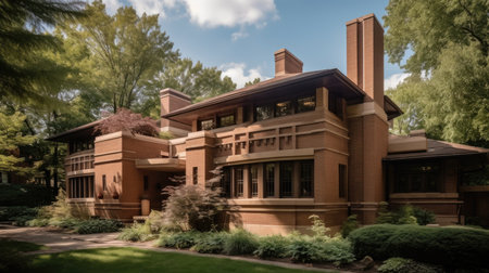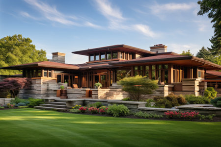 This image showcases a grand house with a generous front lawn, A Frank Lloyd Wright-inspired prairie house, AI Generated