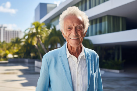 Portrait of a stylish senior man in a patterned suit, showcasing character and a bold fashion sense