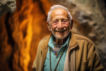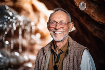 Portrait of a smiling senior man standing in a cave with icicles