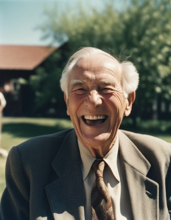 Portrait happy senior man with white hair smiling outdoors. Background is blurred image of trees. Cheerful active pensioner. Cheerful kind grandfather. White teeth, wrinkles on the face and neck. AI