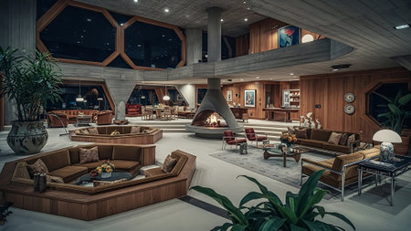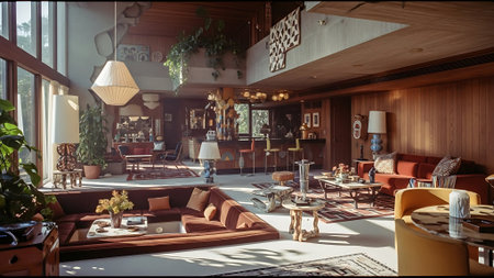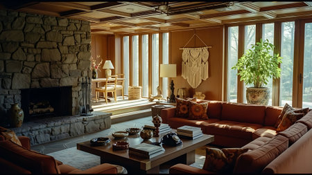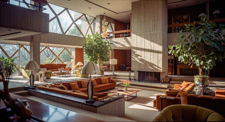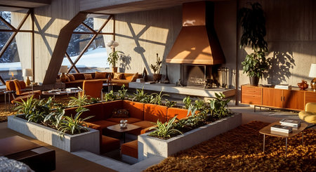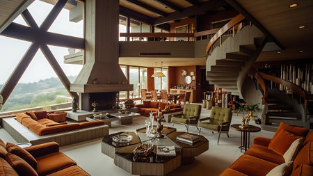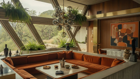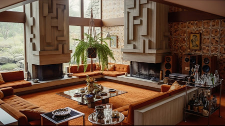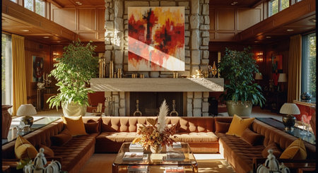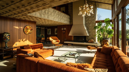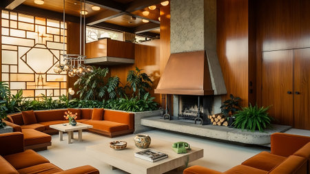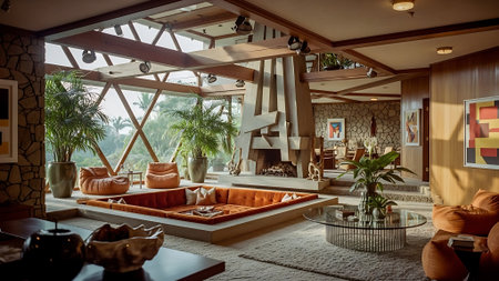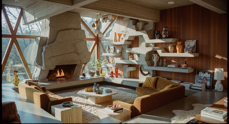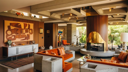 A cozy living room with mid-century modern decor, featuring orange sofas, a stone fireplace, and colorful abstract art on the walls