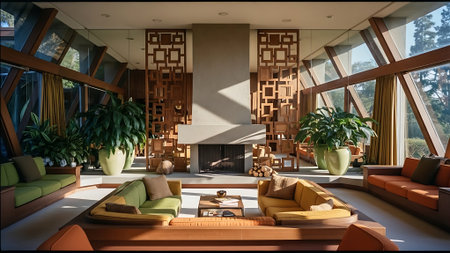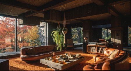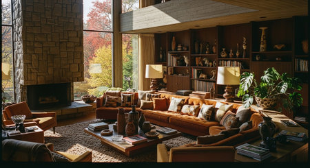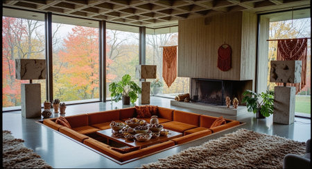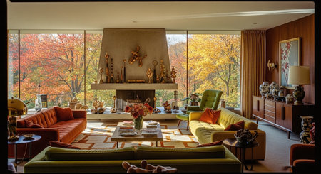 A stylish mid-century modern living room with large windows showcasing autumn foliage, featuring colorful sofas, a concrete fireplace, and decorative vases
