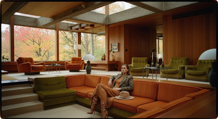 A stylish woman sitting on a large, colorful sectional sofa in a modern living room with large windows showcasing autumn trees outside
