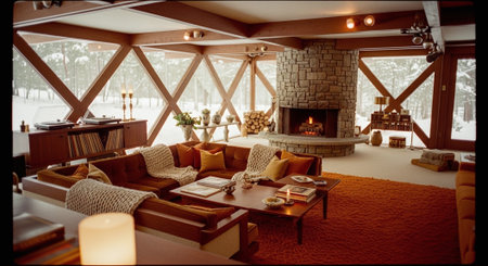 A cozy living room with a stone fireplace, large windows, and snow outside, featuring a warm color palette and comfortable furniture