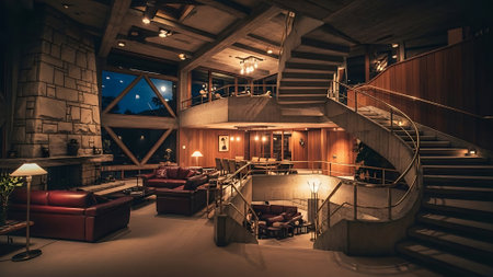 Interior of a luxury hotel lobby with orange sofa and wooden stairs