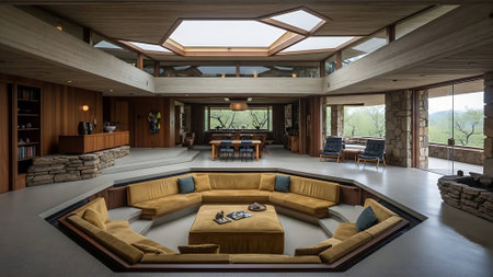 Interior of a modern living room with a view of the lake