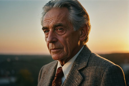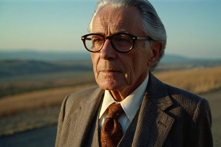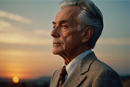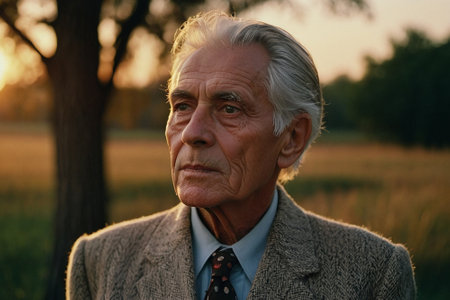 Portrait of a senior man with gray hair outdoors at sunset.