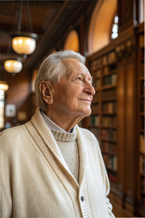 Elderly man reflecting in historic library with warm sweater and gentle ambiance.