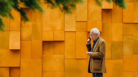 Portrait of happy senior man talking on mobile phone and smiling while standing against the wall : Generative AI