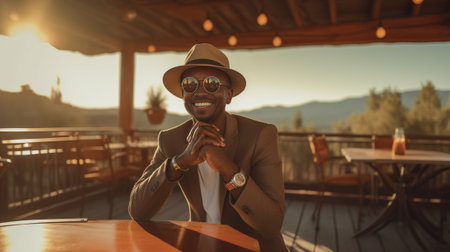 Handsome young Afro American male tourist wearing hat and trendy shades smiling happily while reading sms on smart phone messaging his girlfriend online using free wifi h : Generative AI