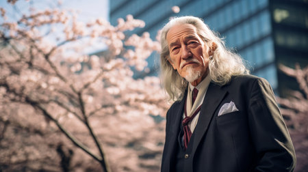 Modern happy smiling elderly Asian man with gray hair against the background of pink cherry blossoms and metropolis city. Businessman, spring blossoms, happiness joy dreaming love, Mental health, psychological treatment concept, positive thinkin