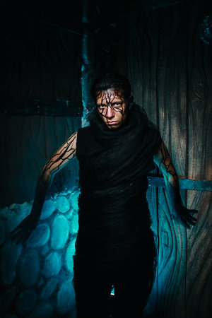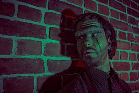 Gothic novel, horror. Halloween. A scary man with scars on his face and neck stands in a dark room with brick walls and looks away warily. Obsessed scientist. Copy space.