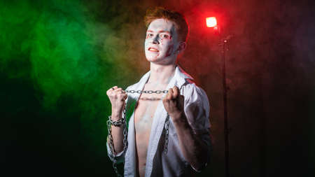 Aggressive psycho with blood on his face and chain in his hands against the background of smoke, illuminated by red and green light