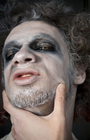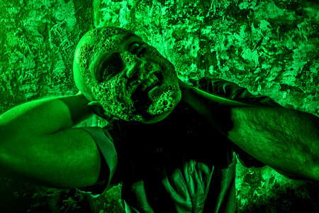 Scary man with horrible scary Halloween zombie makeup in convulsions making faces, looking ominous, trying to scare. Dead guy with wounded bloody scars face isolated against black wall background