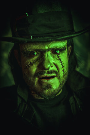 Horror, fantasy. Portrait of a scary bearded man with scars on his face and neck in a black leather hat and black coat, who looks with evil eyes into the camera. 19th century style. Halloween.
