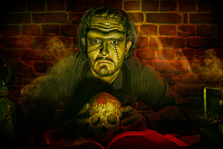 Science fiction novel, horror. A scary man with scars on his face - an obsessed scientist sits in his laboratory and studies old manuscripts. Frankenstein monster. Halloween.