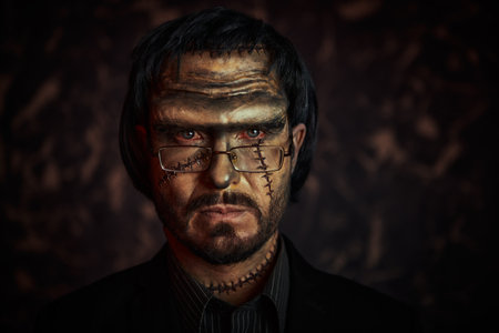 Portrait of an ugly man with scars on his face - the scientist, obsessed with an idea, looks intently into the camera with tired, inflamed eyes. Halloween. Gothic novel, horror.