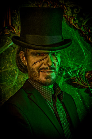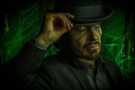 Portrait of a scary mysterious man with huge scars on his face and neck, dressed in an elegant black suit and top-hat, standing in an old castle covered with cobwebs. Gothic horror novel. Halloween.