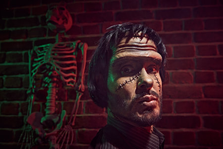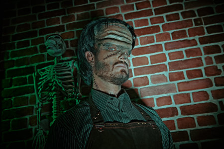 Gothic novel, horror. Halloween. A scary man with scars on his face and neck stands in a dark room with brick walls and a skeleton in the background. Obsessed scientist. Copy space.