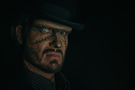 Portrait of a scary mysterious man with huge scars on his face and neck, dressed in an elegant black suit and top-hat on a black background. Gothic horror novel. Halloween. Copy space.