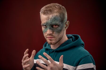Portrait of a handsome young man with vampire style make-up. Shot in a studio.