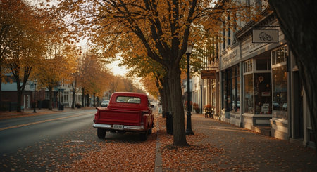 Brick showing panoramic aerial view of a town in autumn with red brick buildings and colorful trees keywords: aerial view, town, autumn, fall,...