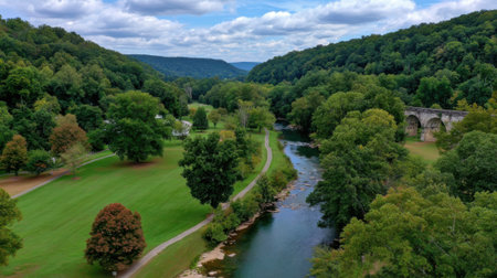 An aerial view of a serene valley featuring a calm river flowing through lush green meadows and dense forests, with rolling hills in the background.