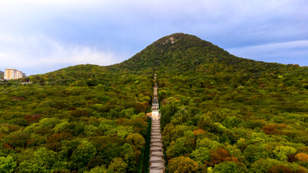 An aerial view capturing a scenic highway winding through vibrant autumn trees with a distant urban skyline, showcasing the beauty of nature and transportation.