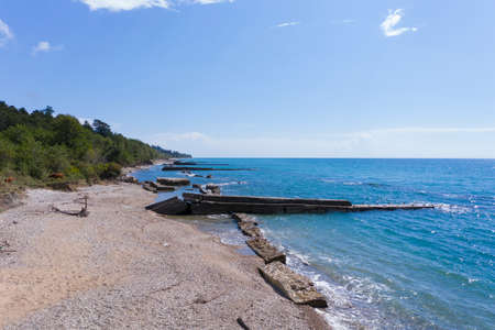 View from the old pier. Breakwaters close-up. Dramatic sunset sky, golden sunlight. Seascape, cloudscape. Baltic sea. Spring. Tourism, landmark, navigation