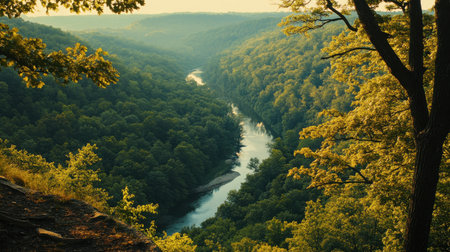 A tranquil river winds through lush green forests, illuminated by the warm glow of the setting sun in Hoosier National Forest. Nature invites peaceful reflection.