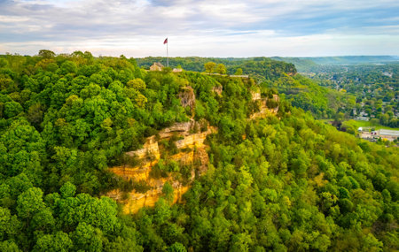 Grandad Bluff at sunset overlooking La Crosse Wisconsin with glowing sky, city view, and scenic sandstone cliff formation.